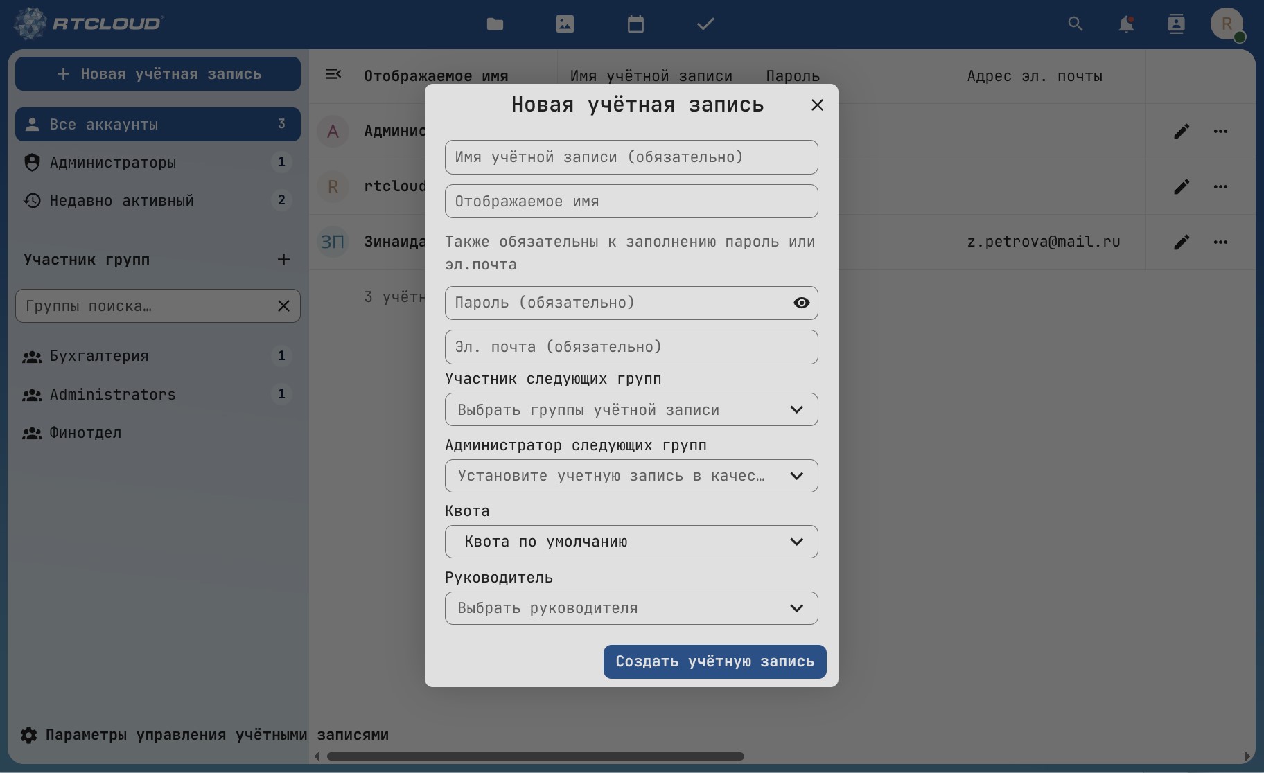 Для создания новой учётной записи пользователя необходимо открыть раздел «Учетные записи». Раздел доступен через иконку профиля текущего пользователя (по умолчанию «Администратор»), расположенную в правом верхнем углу веб-интерфейса RTCloud.Документы.