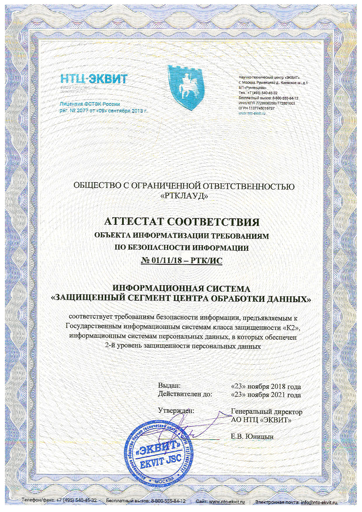 Аудит и аттестация объекта выполнены специалистами АО НТЦ «Эквит» (лицензия ФСТЭК России № 2077 от 09.09.13г.)