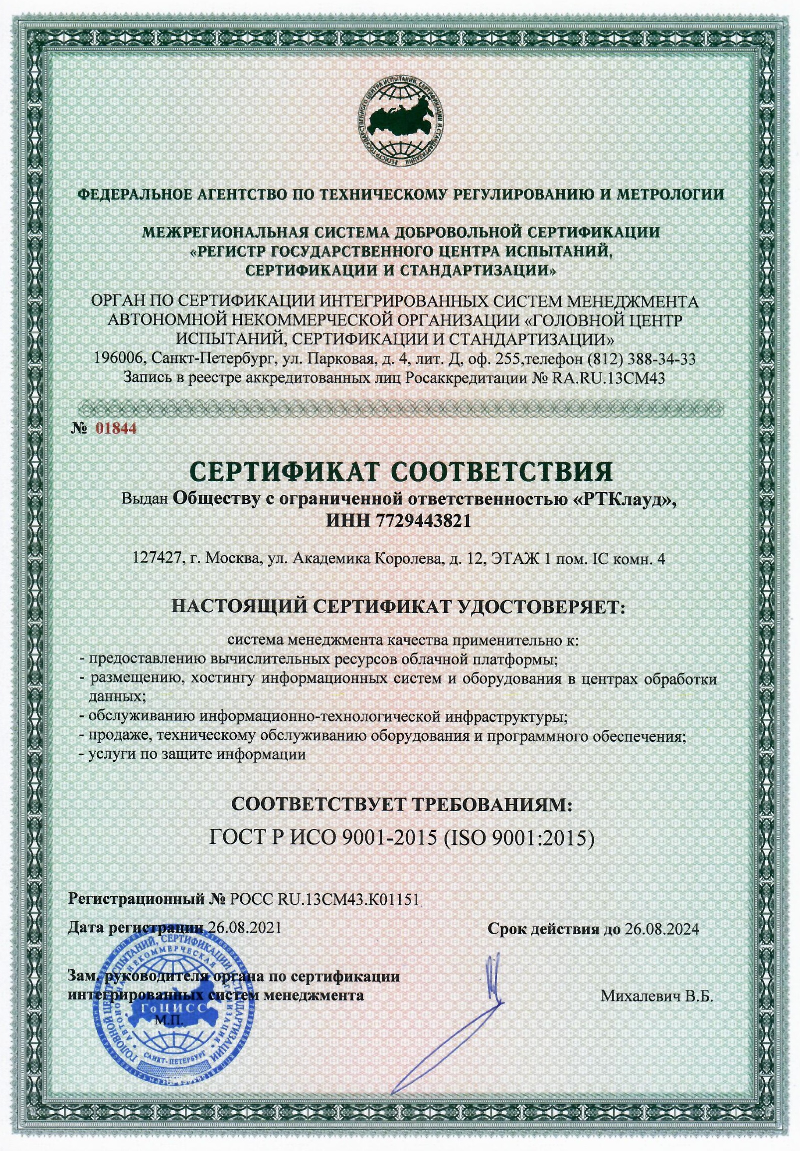 RTCloud подтвердил соответствие Системы менеджмента качества (СМК) требованиям международного стандарта ГОСТ P ИСО 9001-2015 (ISO 9001:2015).